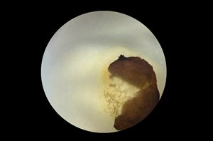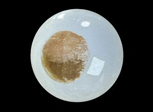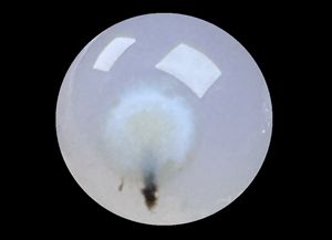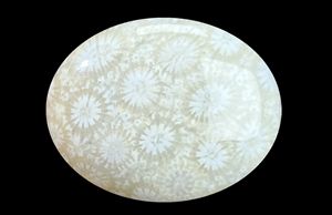 玉化珊瑚戒面上绽出朵朵白菊。 …