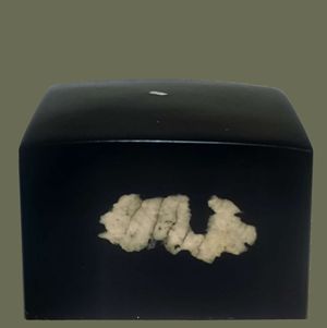 此石乌黑却有着白色纹样,一种面市不久,名为印度黑的印石。仅观图片,未能试刀,不知石性。奈何喜其纹案,虽索银不菲,亦纳之无豫。印石之侧有一白色峰石,其妙在“横看成岭侧成峰”。横看,现仙家之清供 “卧云”。紫清先生有诗云: