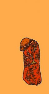 平整出印面发现其内蕴黄瓤,且印面颇似一老僧之轮廓,些许诧异。继而,略凑数刀,助其化形。印蜕经数字化着色,老僧之袍为之焕然一新,一幅“老衲正孤吟”的形象跃然纸上。